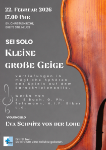22. Sei Solo-- Vertiefungen. Musik für Barockcello solo von Biber bis Bach. / Christuskirche Neuss, Breite Str. 121 / Eintritt frei, Spenden erbeten. / 17h
